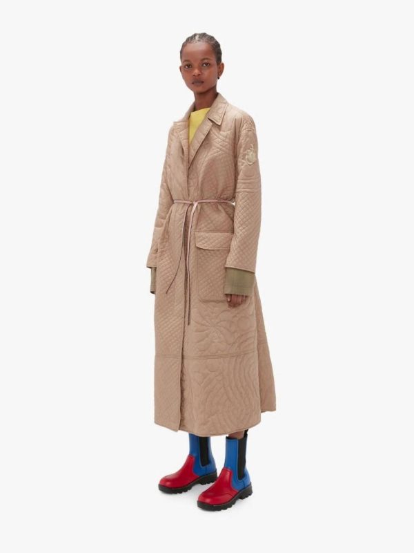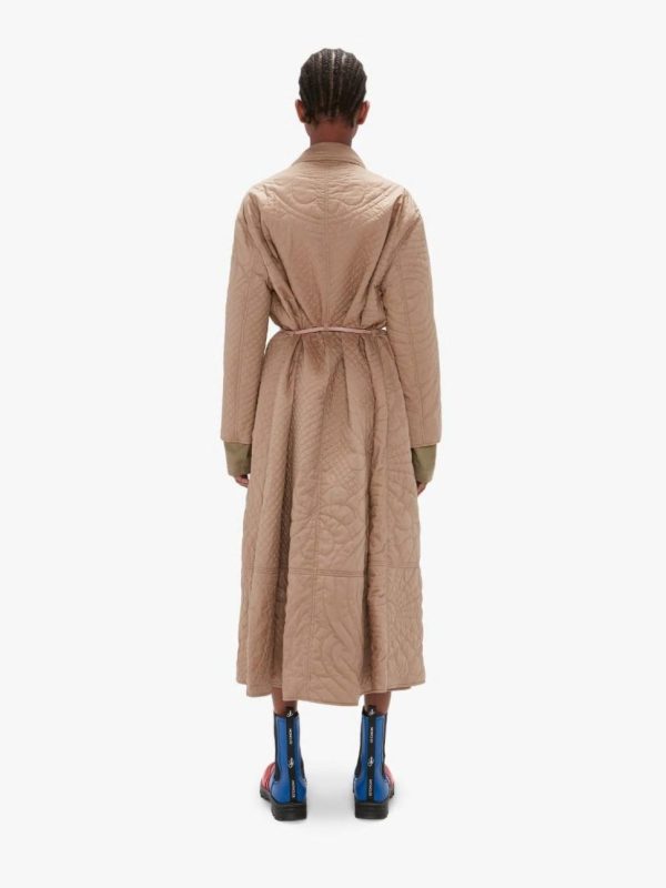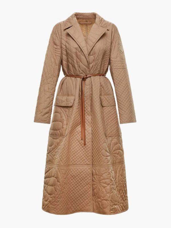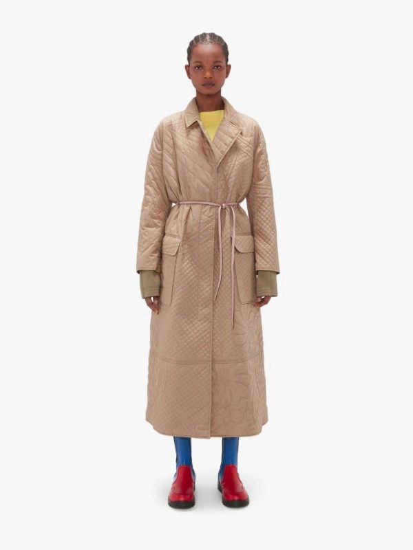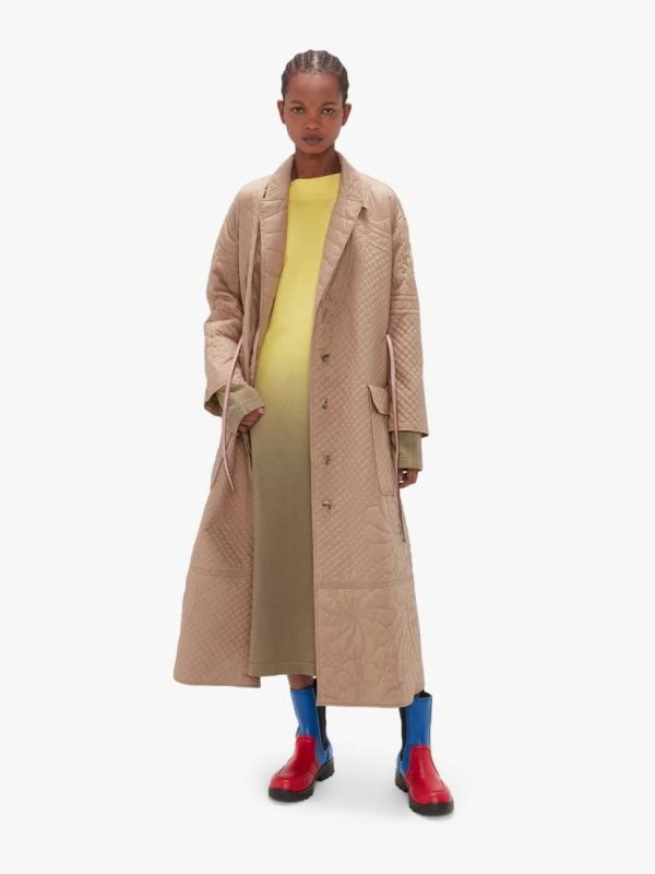 Continuing a theme explored with the Moncler Genuis AW20 collection, Jonathan Anderson reached into the JW Anderson archives to find inspiration for the SS21 edition of Moncler Genuis. Silhouettes first seen in the JW Anderson Resort 2014 collection are rediscovered and reinterpreted with quilted fabrics — a reference to Moncler’s heritage and to a vintage quilt from Jonathan’s home. Notions of Britishness also appear, with sail and sailing inspired fabrics and stitching. The Penbryn coat showcases an elegant nylon léger texture updated with vintage inspired flower and diamond quilting constructed in a lightweight cotton padding with a tonal nylon léger lining, sandwich filled. Button up this overcoat with hidden button closures and leave open or closed with the belt.