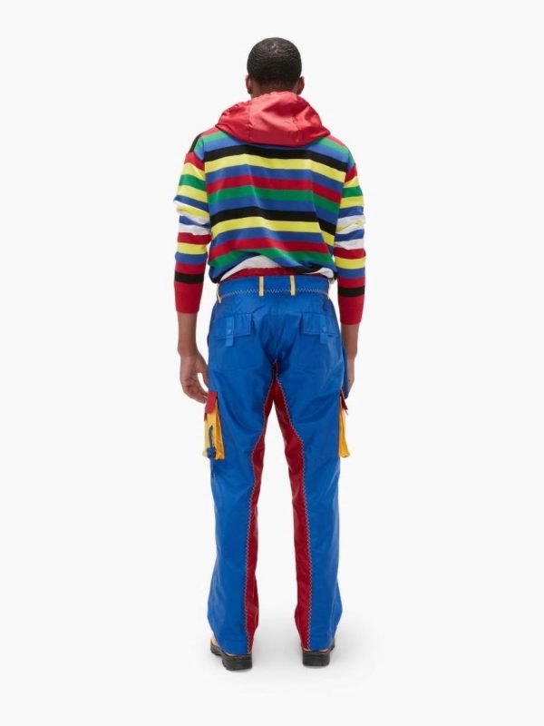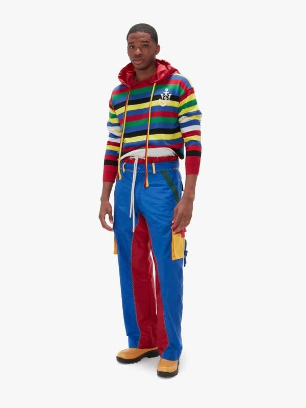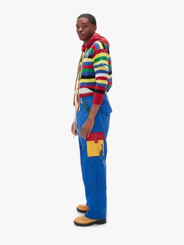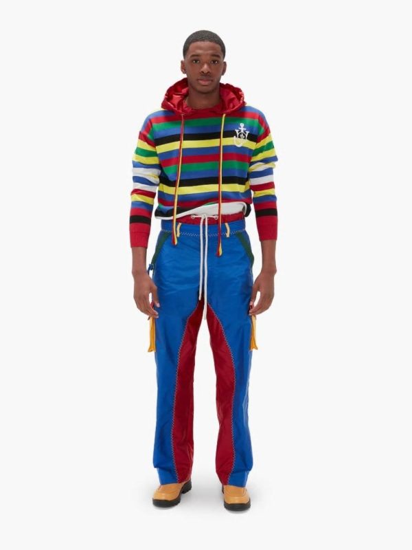 Continuing a theme explored with the Moncler Genuis AW20 collection, Jonathan Anderson reached into the JW Anderson archives to find inspiration for the SS21 edition of Moncler Genuis. Silhouettes first seen in the JW Anderson Resort 2014 collection are rediscovered and reinterpreted with quilted fabrics — a reference to Moncler’s heritage and to a vintage quilt from Jonathan’s home. Notions of Britishness also appear, with sail and sailing inspired fabrics and stitching.